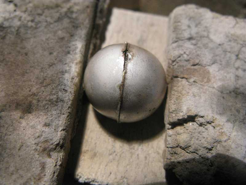 Punching hemispheres with dome punches and blockA dome block is a device with usually hemispheral dies in it, made of hardened steel (sometimes of brass or even hardwood) intended for making hemispheral shapes from sheet metal. A dome punch is a globular punch to force sheet metal into a globular shape by giving it a hammer blow on the metal sheet disc which is laid in a dome block die. I use sheet metal of 0.25mm thick in a disk shaped 22mm diameter to get a 16mm diameter sphere. I just cut this out of sheet metal. Punching doms of silver or other malleable metal requires some experience. The problem is that the edges of the dome can be damaged when putting into a smaller die of the punch block.Fortunately, all errors made by damaging is not a waste of material, as I just remelt them, pour it into a small slab which I rollagain into sheet. | |